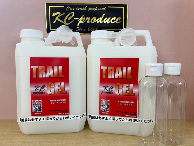 車両用水垢洗浄剤 超超ビックトレールジェル2L×2本 KCプロデュースステッカーつ付き (水垢洗浄剤及び鏡面アルミホイール下地剤) 特許庁商標登録 6573283号 PL保険加入 東京海上日動 〈特徴〉 ☆トレールジェルは洗浄成分の効果が洗浄面に留まりやすく少量のジェルでたくさんの面積を洗うことができとても経済的です。 ☆4種類の酸で異なる性質の汚れに対応しています。 ☆車のボディ塗装面、ステンレスバンパー、メッキ、シャーシ、観音扉、アオリ、アルミホイール、スチールホイール全てこれ1本で洗えます。 ☆使い方は簡単♪スポンジで取って洗うだけです ☆乗用車のボディの塗装を痛めない添加剤を配合し汚れの再付着も少なく撥水効果もあります。 ☆トラック、バス用アミホイールの放置して白くモヤッとした酸化皮膜を除去することでアルミホイールを磨きやすくします♪ 何もしないで磨くよりトレールジェルで洗ってから磨けば抜群の仕上がりの美しさと磨きスピードを体感していただけます♪ ☆新型日産UDクオンのディスクブレーキのブレーキダストにお悩みの方も多いと思います。サッと洗ったアルミホイールにトレールジェル原液を塗って乾かないうちに流していただければスッキリ綺麗になります。 〈使用方法〉 ①ボディのホコリや砂を水で流す (下洗いはいりません) ②濡れたスポンジにジェを適量とり泡立てて洗浄する。 ③たくさんの水でしっかり流す 〈注意事項〉 ※ボトルをよく振ってからご使用ください。 ☆フロントガラス、バックミラーの洗浄は変色の恐れがございますのでお控えください。 ☆乗用車の屋根を洗浄して垂れる場合は予めガラス面を濡らしておいてジェルが垂れてきたらすぐ水道で流していただきジェルがガラス面にとどまらないように注意してください。 ☆ゴム手袋を着用してください ☆ゴーグルなどで目を保護してください ☆皮膚や衣服に付かないようにしてください。 ☆他の洗剤と混ぜないでください。 ☆本品を薄めないでください。 ☆換気のいい場所で作業してください。 ☆保存の際はポリ容器のまま風通しの良い場所で保管してください。 ☆ボトルは丁寧にお取り扱いください、 (株)KCプロデュース